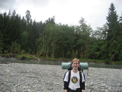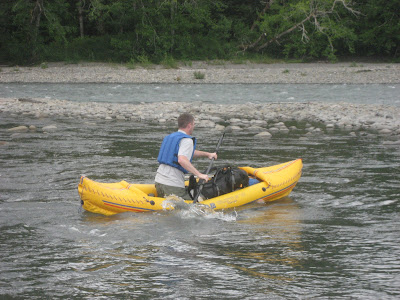 5:30 PM: Driving the newly established Route 21 access road, we arrive at the trailhead. In the past, the Upper Queets River Trail was accessible from the main road, by way of the Lower Queets River Trail, however, a landslide has severed this access. The trailhead must now be reached by fording / rafting the Queets River itself. It is usually suggested that hikers plan trips to this area in Fall and Early Winter, when the water level is low and fordable. We are not deterred by such advice and instead employ the assistance of an inflatable kayak to carry us across. A true adventure can’t begin without attempting the ridiculous. It takes five river crossings (including returns) to shuttle our packs and ourselves to the north side of the Queets River Valley.