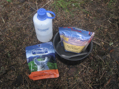 6:00 PM: So three hours later… I wake up from my nap and start to make dinner. This consists of filtering some water, boiling it on the camp stove and pouring it into a pouch. Tonight’s feast is Beef Stroganoff with Noodles, a Clif Bar, a Clif Shot, Water and Cheesecake for Two (for myself). One cup is eight ounces. I know that by heart now. It rains the rest of the night.