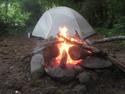10:00 AM: This getting up late thing is pretty nice. We decide to keep our camp established at Spruce Bottoms and day hike with lighter packs to the next leg of the trail. But we first start with a hearty fire and some breakfast from a pouch, one of many such meals. Today brings rain, but what are you going to do, it’s the rainforest. The morning fog is thick on the Queets River and we imagine we will continue to be the lone travelers on the trail.