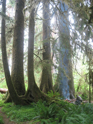 7:30 PM: We are now squarely in the midst of the only legitimate rainforest in the continental United States. The forecast calls for rain, but it does not rain this first day of the hike. We contemplate setting up camp at the shore, but decide that we came here to hike and so we press onward. At about the 5-Mile mark is Spruce Bottoms Campsite and we make that our goal. The moss which covers everything is brown from the relative lack of summer rain, but still there is plenty of green for this trip.